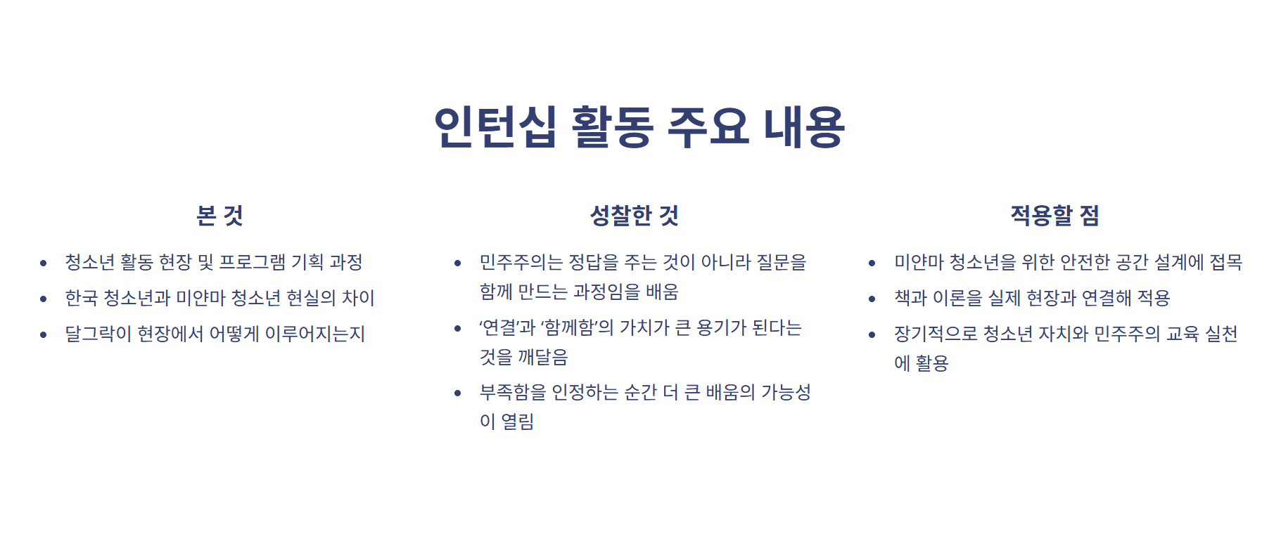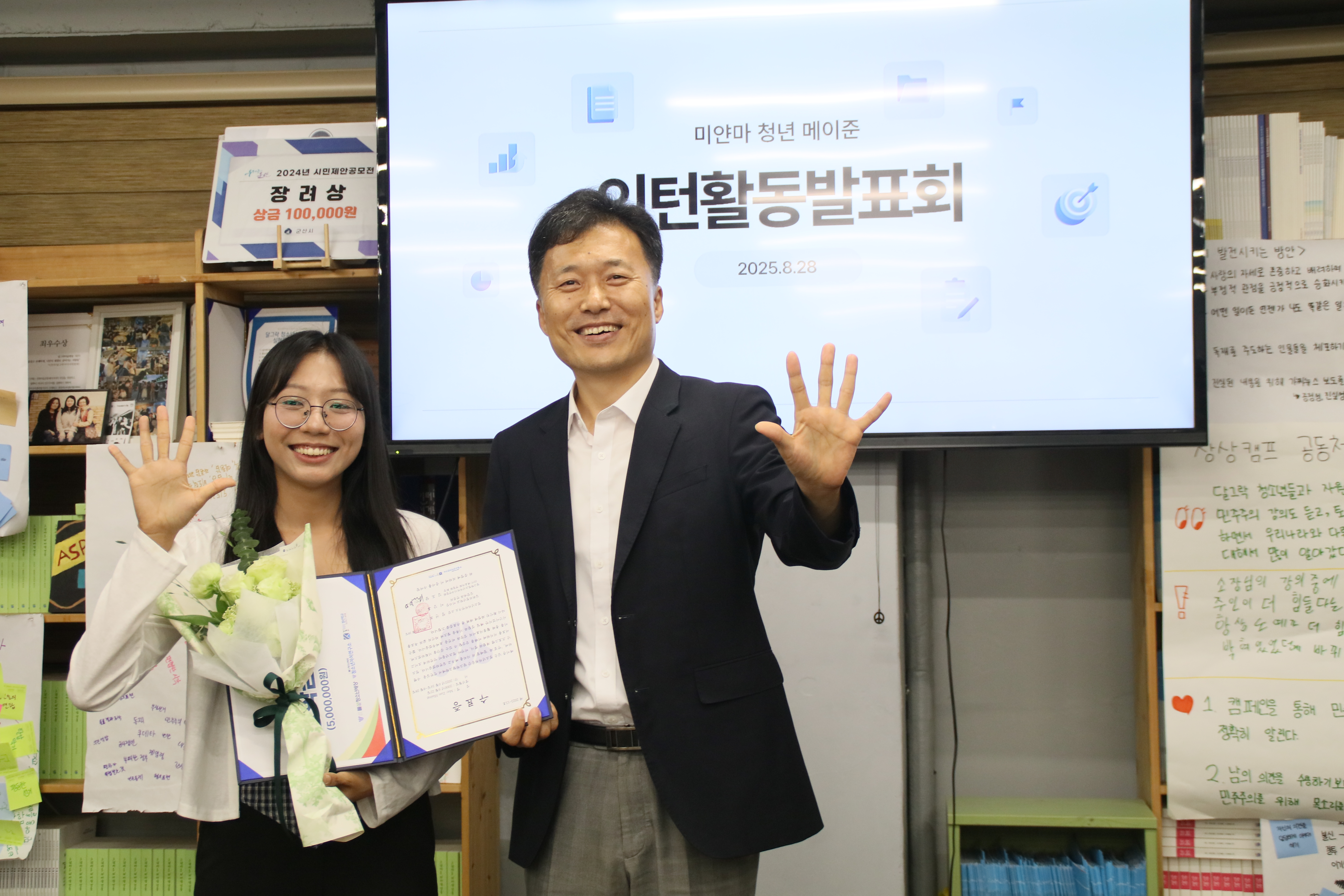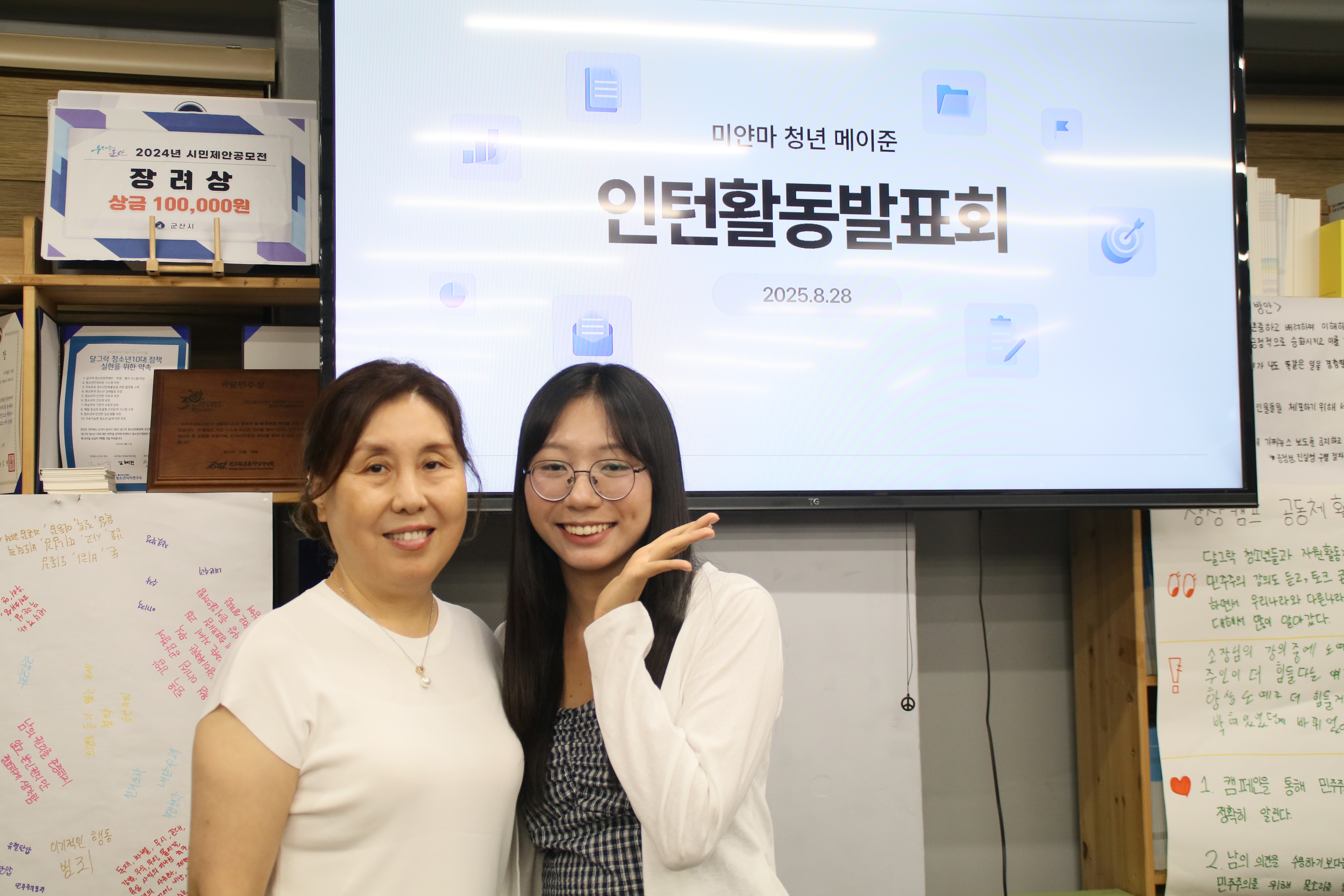나는 메이의 비전이 반드시 이루어질 것이라고 믿는다. 여러 번의 계엄과 내란, 쿠데타로 나라는 내전으로 치달아 엉망이 되었지만, 그곳에 돌아가서 지역에 “청소년의 목소리를 키워 평화로운 미래를 함께 만들어 가는 데 기여”하는 게 비전이라고 했다. 메이를 보면서 최 위원님은 ‘연대’와 ‘다정함’이 세상을 바꿀 것이라고도 했다. 김 이사님은 자신도 딸을 키우는데 너무 힘겨운 길을 가는 것 아니냐면서 눈물 지었다.