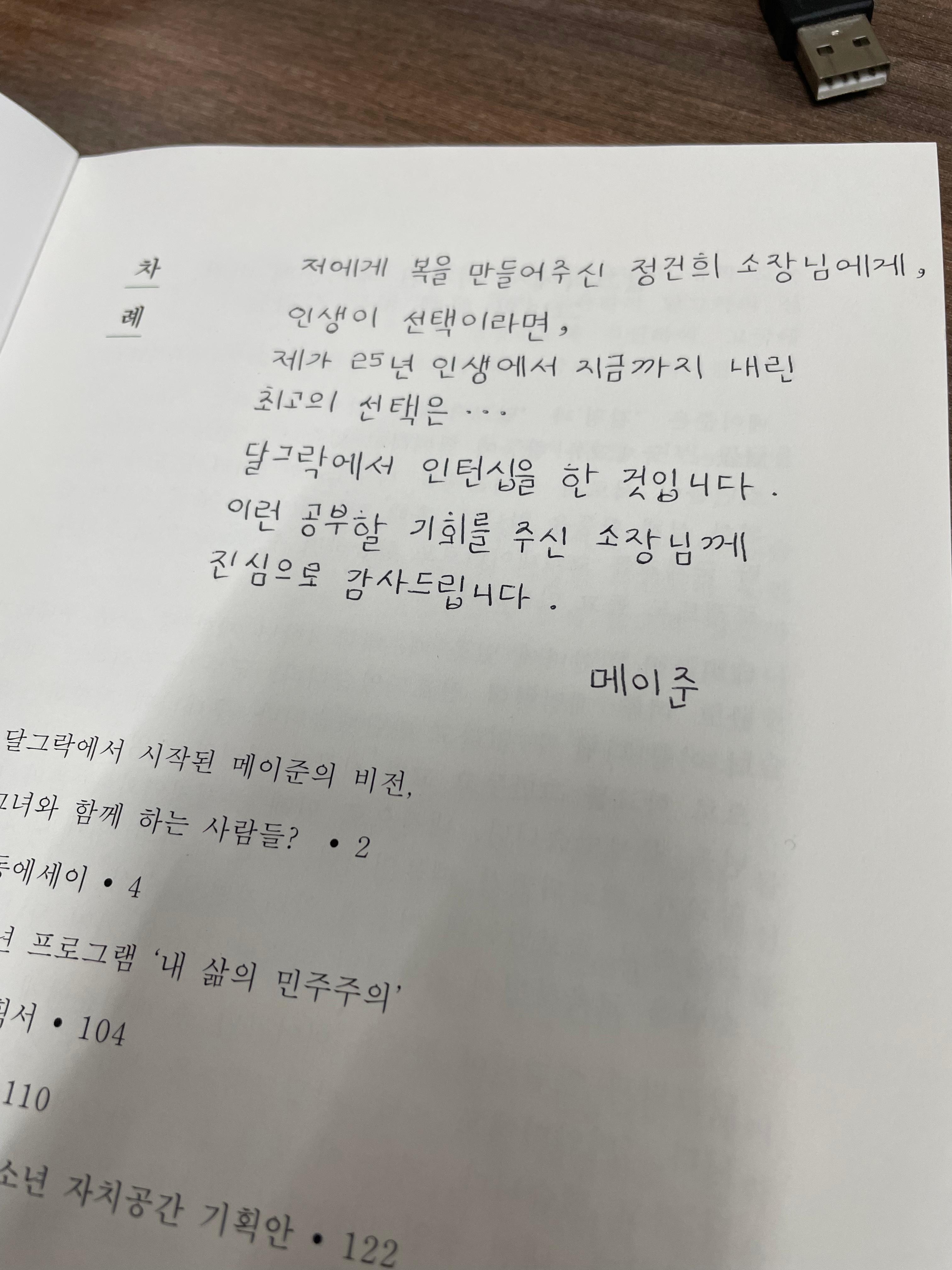우리 메이준이 두 달여의 달그락 인턴 활동을 마치고 최종 발표회를 했다. 위원, 이사님들 몇 분과 청소년 대표 등이 함께했다. 울지 않으려고 했다는데...
