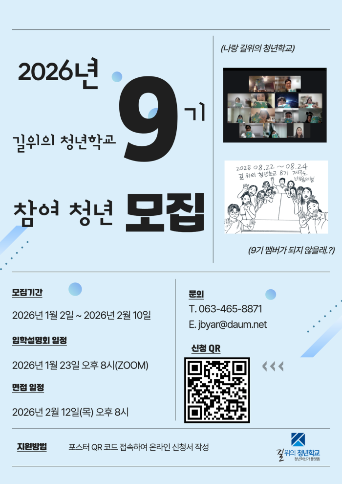 길위의청년학교(이하 길청) 9기 모집을 위한 ‘입학 설명회’를 엽니다. 온라인 줌(zoom)으로 여니 관심 있는 분들은 누구나 부담 없이 참여하세요.