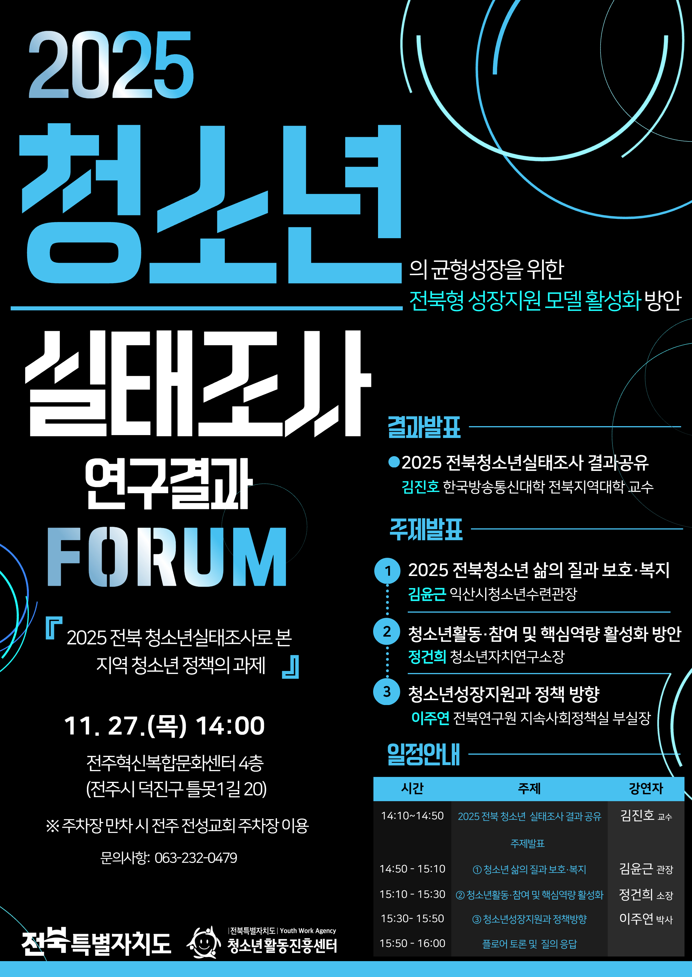 2025년 전북 청소년 삶의 질과 관련된 실태조사가 있었다. 관련해서 오늘 포럼이 열렸고 몇 마디 거들었다. 그 중 청소년 삶의 질에 대한 부분과 청소년활동, 참여 등에 대해서 주장한 몇 가지 내용만 정리하면 다음과 같다.